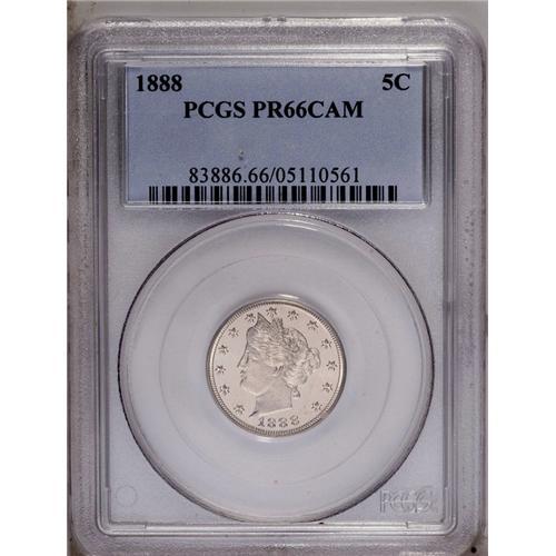 <B>1888<5C> PR66 Cameo PCGS.</B></I> Brightly mirrored with appreciable, if not stark contrast between fields and devices. Even after several years of the major grading services recognizing the cameo designation, precious few 1888 nickels have been certified as such. Population: 3 in 66 Cameo, none are finer (2/06).