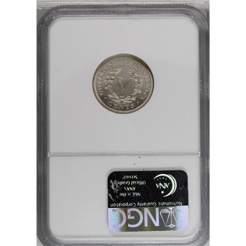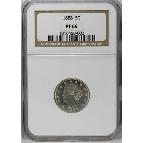 <B>1888<5C> PR66 NGC.</B></I> A pleasing Gem proof example with light gray surfaces and hazy toning. Wispy gold color can be seen near the borders on each side.