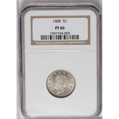 <B>1888<5C> PR66 NGC.</B></I> The fields are moderately reflective and show little post-strike damage. A shallow layer of golden patina has settled over both sides, further adding to the originality and appeal of this Premium Gem.