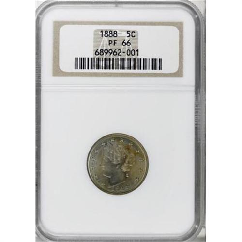 <B>1888 5C PR66 NGC.</B></I> Rich olive, green-gold, and nickel-gray toning drapes the luminous surfaces of this sharply struck proof Liberty nickel. Marvelous preservation and eye appeal to match. NGC has graded just nine finer examples (1/08).<BR><BR><B>Coin Engraver:</B> Charles E. Barber<BR><BR><b>Shipping:</b> Coins & Currency (<a target="_blank" href="http://www.heritageauctions.com/common/shipping.php">view shipping information</a>)