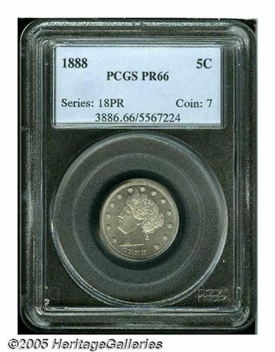<B>1888<5C> PR66 PCGS.</B></I> A modestly reflective specimen, particularly on the obverse, with a mere hint of silver-gray patina in the fields. The exactness of detail and angled glimmer confirm its proof status. A small contact mark is seen at the base of Liberty's neck.