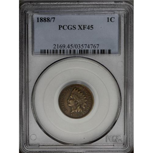 <B>1888/7<1C> XF45 PCGS.</B></I> FS-010, Snow-1. The base of the underdigit 7 is clearly visible beneath the left half of the final 8 in the date. The obverse of this modestly worn example varies between golden-tan and deeper violet shades while the glossy reverse is primarily a rich brick-red color. <BR><BR><B>Important notice:</B> Heritage usually auctions material at the rate of 200-250 lots per hour. On some occasions eBay Live bid software or the Internet may not be able to keep up with the pace of the auction. We recommend placing a realistic absentee bid now as insurance to avoid disappointment. Occasionally the auctioneer may eliminate or reject an eBay Live bid, and the auctioneer may also reopen a lot after the close of the eBay live bidding (usually because we missed an audience bid), and may reject your bid even if it shows you as the winning bidder. By bidding via eBay Live, you agree that Heritage may award the lot to another bidder at its sole discretion under the circumstances described above or any other reasonable circumstances. Since eBay bids are not shown to us until we open the lot on the floor, we treat those bids just like floor bids. In most cases the floor responds before the eBay bid is presented to us, due to Internet lag time, so for consistency we have made it a policy that floor bids are always considered first over tie eBay live bids. Also please note that all Heritage lots purchased through eBay Live carry a 20% Buyer's Premium. Please make sure you read the Terms and Conditions before you bid. This lot is being auctioned in conjunction with a live floor auction by Heritage Galleries & Auctioneers. All final auction and invoice information will be supplied by Heritage Galleries & Auctioneers, and all other information should be considered preliminary. Lot:410 <BR><BR><B>Winning Notification and Billing:</B> After the FINAL session in this auction is complete, Heritage will send e-mail and snail mail invoices. This process normally takes several days. All final auction and invoice information will be supplied by Heritage Galleries & Auctioneers, and all other information should be considered preliminary. <BR><BR>This auction will be conducted on a live auction floor and over the Internet through eBay Live. If you choose to place an absentee bid, please take a moment to <font color='#0000ff'><u><a href='http://pages.ebay.com/liveauctions/help/before/laabsentee.html'>learn how eBay Live absentee bidding works</a></u></font><font color='#000000'>