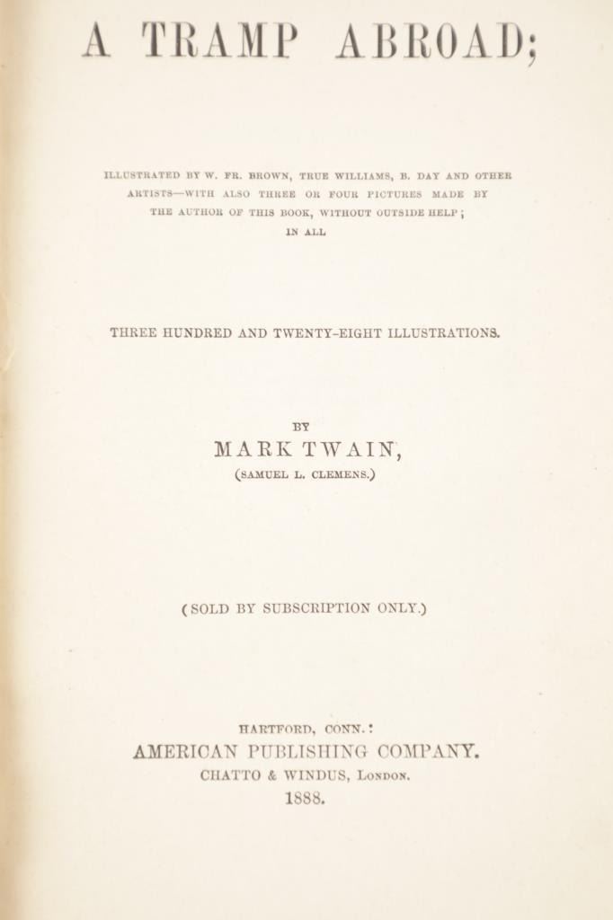 Featured in this lot is this 1888 edition of "A Tramp Abroad," by Mark Twain. This book was originally published in 1880 The book contains an astounding 328 illustrations. The book is bound with a gilded cover and shows very good overall condition. The condition of this book is well preserved with no obvious signs of damage to the cover and spine and shows preserved behind a clear dust jacket. The measurements of this book is 9" x 6".
