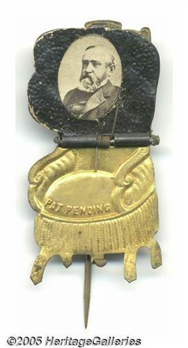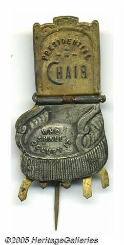 <B>1888 Benjamin Harrison Mechanical Chair Pin</B></I> The mate to the Cleveland version offered elsewhere in this catalog (see description). Great condition with beautiful original photo. Once again this is the larger size, 1" x 1.875". From the former Joe Brown Collection. Lot:260