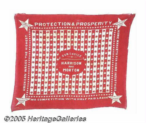 <B>1888 Benjamin Harrison and Levi Morton Bandana</B></I> Appealing bold red and white design. Essentially crisp condition, with very strong color. There is a minor bit of edge unravelling, apparently as made, and some subtle traces of light brown staining, barely noticeable. Overall a well-above-average appearance for this variety. 25 x 21". Lot:260