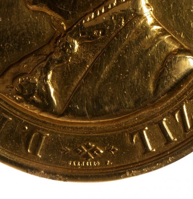 1888 gold medal for the abolition of slavery in Brazil issued by Imprensa Fluminense-Derby-Club. Obverse with Princess Isabel facing left. Reverse with legal decree and date in a wreath. Engraved by Carneiro, 46mm. 78.0 grams, 22k. Extremely rare in gold. Fine to Very Fine, old polishing, edge nicks.