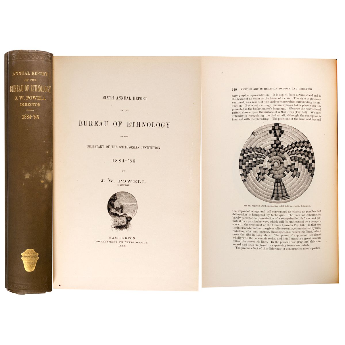 Includes Introduction by director, J.W. Powell, and the following papers: 1) "Ancient Art of the Province of the Chiriqui, Columbia," Holmes, William H., with focus on objects of art, metal, clay, unpainted and painted ware and musical instruments. 2) "A Study of the Textile Art in its Relation to the Development of Form and Ornament," Holmes, William H., with focus on development of a geometric system within art, color phenomena, and extension of textile ornament to other forms of art. 3) "Aids to the study of the Maya Codices," Thomas, Cyrus, with discussion symbols and signification of the Dresden Codex (a Maya document.) 4) "Osage Traditions," Dorsey, Rev. J. Owen, with traditions of the elders and translations of texts. "The Central Eskimo," Boas, Dr. Franz, with orthography and geography of Northeastern America, distribution of tribes, trade between tribes, transportation by boats and sledges, social and religious life, tales and traditions, and science and the arts. With several plate illustrations and text figures (all in black and white.) Two full color maps in pocket at back (Eskimo tribes of Northeastern America.) Hardbound in brown cloth with lettering and illustration of Native Person in gilt. 675 pp. 8" x 10.5.". - Vinegar Collection