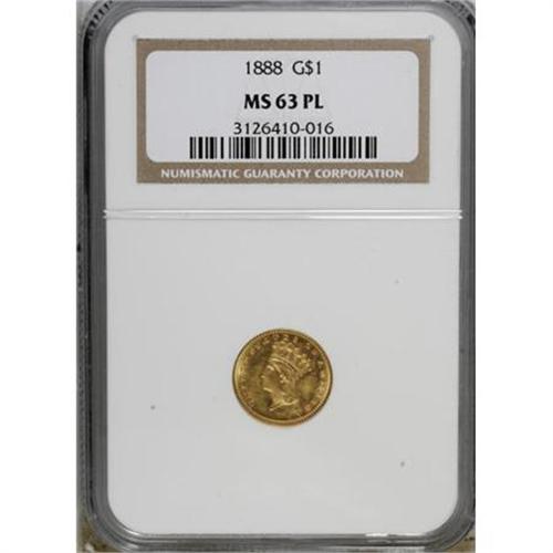 <B>1888 G$1 MS63 Prooflike NGC.</B></I> The honey-gold surfaces of this captivating Select coin offer undeniable reflectivity and top-notch eye appeal. Well-defined with only a few wispy abrasions on each side. Census: 2 in 63 Prooflike, 11 finer (2/08).<BR><BR><B>Coin Engraver:</B> James B. Longacre<BR><BR><b>Shipping:</b> Coins & Currency (<a target="_blank" href="http://www.heritageauctions.com/common/shipping.php">view shipping information</a>)