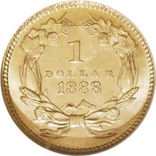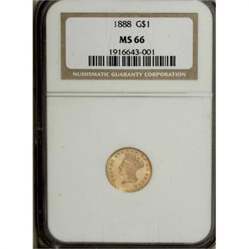 <B>1888 G$1 MS66 NGC.</B></I> This Premium Gem exhibits an exquisite strike and pretty brass-gold surfaces that exude radiant luster. Impeccably preserved, with no significant marks. The reverse is rotated counterclockwise by a few degrees. A low mintage issue of 15,500 pieces which has nevertheless proven to be readily available at grades up to and including MS66. Census: 92 in 66, 40 finer (6/07). <BR><BR><B>Coin Engraver:</B> James B. Longacre<BR><BR><b>Shipping:</b> Coins & Currency (<a target="_blank" href="http://www.heritageauctions.com/common/shipping.php">view shipping information</a>\)