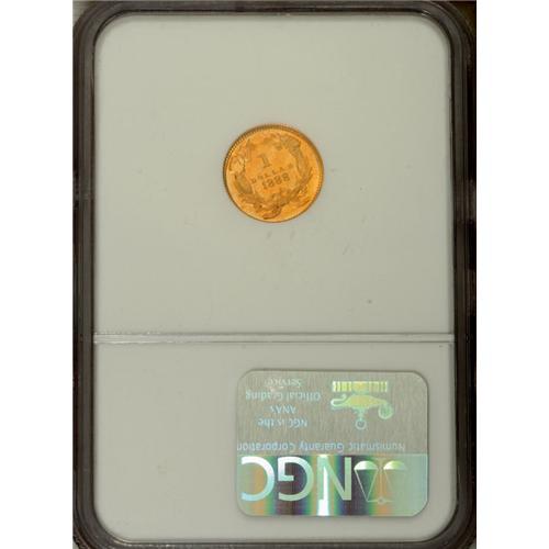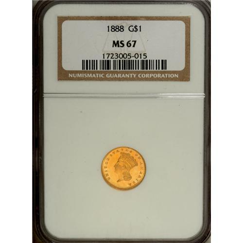 <B>1888 G$1 MS67 NGC.</B></I> A highly lustrous and suitably struck honey-gold piece, exquisitely preserved and coined from dies rotated slightly counterclockwise. While it is difficult to imagine a gold dollar any finer, both NGC and PCGS claim they exist, though they have certified only three apiece (11/06).<BR><BR><b>Shipping:</b> Coin/Currency (<a target="_blank" href="http://www.heritageauctions.com/common/shipping.php">view shipping information</a>)