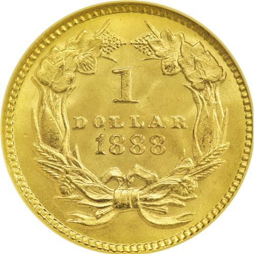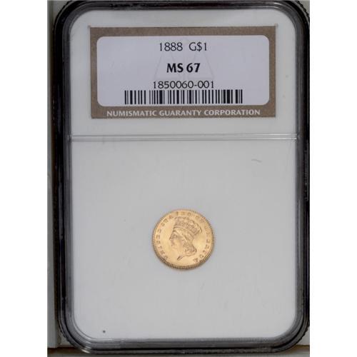 <B>1888<G$1> MS67 NGC.</B></I> This beautiful Superb Gem is flawless aside from a nearly imperceptible green spot near the E in UNITED. The strike is pinpoint-sharp except for RT in LIBERTY, which were weakened by a mint worker's lapping of the obverse die. The 1888 is more available than suggested by its low mintage of 15,501 pieces, but third party populations rapidly dwindle above the MS66 level. Census: 35 in 67, 2 finer (7/06).