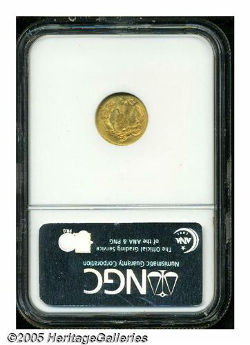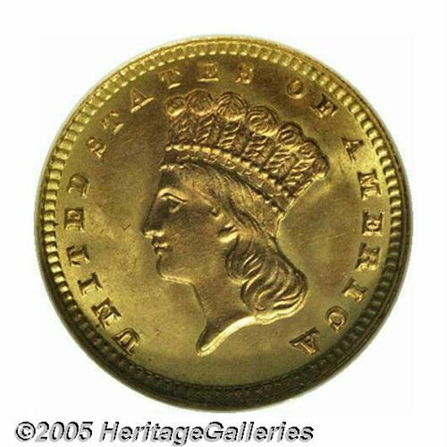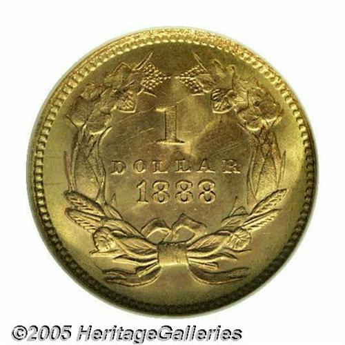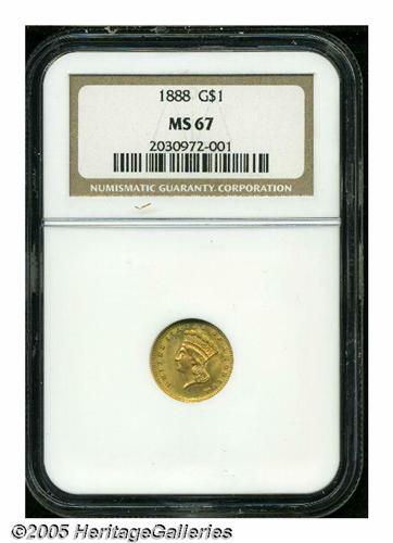 <B>1888<G$1> MS67 NGC.</B></I> While many surviving 1888 gold dollars are bright and prooflike, this piece differs considerably in appearance. There is no reflectivity in the fields, and each side is covered with rich crimson-gold and lilac patina. Exceptionally clean and fully struck throughout, this is an interesting and very attractive type coin for the 19th century gold collector. Population: 31 in 67, 2 finer (5/05).