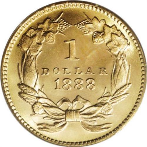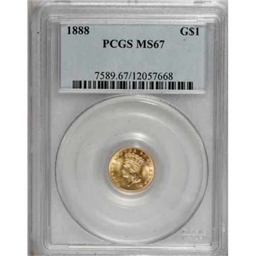 <B>1888 G$1 MS67 PCGS.</B></I> One would think that the lack of abrasions would be the strongest element on an MS67. With this piece, however, it is the mint luster. The mint sheen is bright, dazzling bright. Each side is yellow-gold with no trace of other colors when closely examined. Fully struck, this is a terrifically attractive type coin.<BR><BR><B>Coin Engraver:</B> James B. Longacre<BR><BR><b>Shipping:</b> Coins & Currency (<a target="_blank" href="http://www.heritageauctions.com/common/shipping.php">view shipping information</a>)