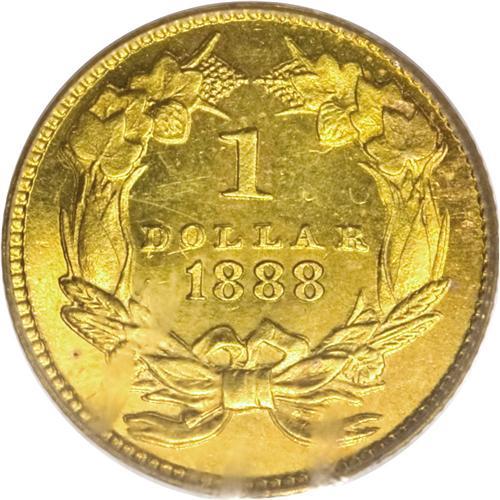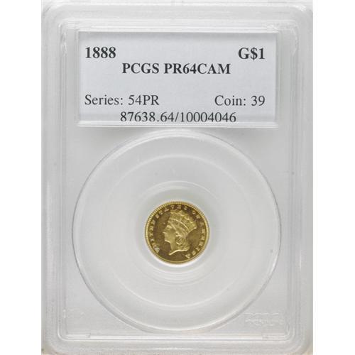 <B>1888 G$1 PR64 Cameo PCGS.</B></I> A lovely Cameo proof with brilliant yellow-gold surfaces and deeper honey-gold toning, mostly on the reverse. This glittering proof example has wonderful, deeply mirrored fields and lustrous, sharply detailed devices. Population: 8 in 64 Cameo, 11 finer (1/07).<BR><BR><b>Shipping:</b> Coins & Currency (<a target="_blank" href="http://www.heritageauctions.com/common/shipping.php">view shipping information</a>)