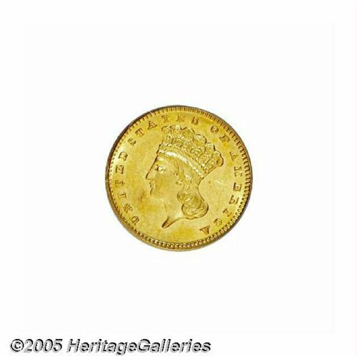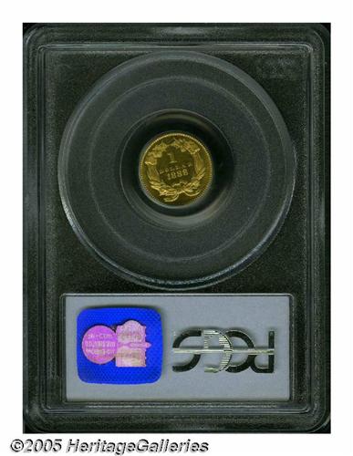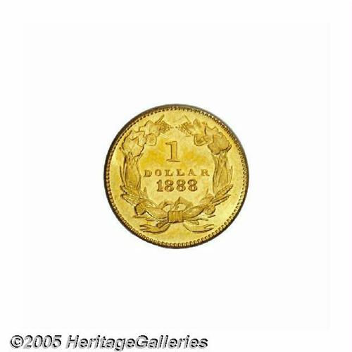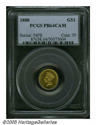 <B>1888<G$1> PR64 Cameo PCGS.</B></I> Even though the mintage of proof 1888 Gold Dollars was comparatively large (1,079 pieces struck), quite a few specimens were melted at year's end as unsold or mishandled through the ensuing decades. This is a lovely, two-toned proof with glittering surfaces and bright yellow-gold color overall. Several minor marks serve to limit the grade. Population: 6 in 64 Cameo, 11 finer (6/05).