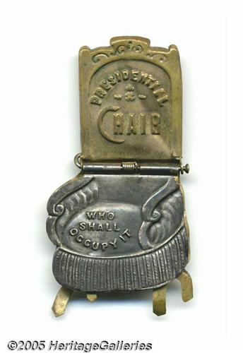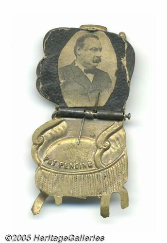 <B>1888 Grover Cleveland Mechanical Chair Pin</B></I> Back and seat read, "The Presidential Chair...Who Shall Occupy It ?" Seat flips open to reveal the candidate's portrait. This is the original photo which is rarely the case with these and is in great shape. Excellent working order. Note that these chairs came in two sizes and this is the significantly larger version. 1" x 1.875". From the former Joe Brown Collection. Lot:260