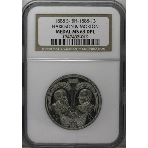 <B>1888 Harrison & Morton Campaign Medal MS63 Deep Mirror Prooflike NGC.</B></I> Sullivan-BH-1888-13. White metal. 32mm. Many survivors are holed for display from a ribbon, but not the present piece. A sharply struck, flashy, and untoned representative. Nearly imperceptible hairlines are located upon a thorough evaluation.<BR><I>From The Troy Wiseman Collection.</B></I>