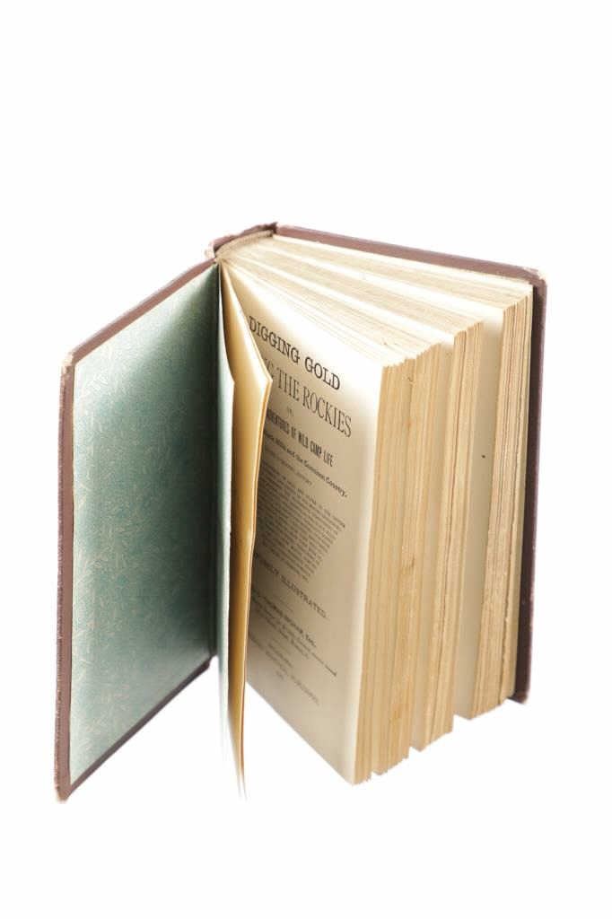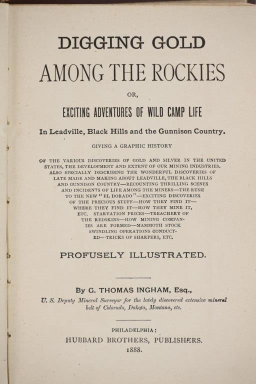 For your consideration is this 1888 of “Digging Gold Among the Rockies” by G. Thomas Ingham, Esq., Hubbard Brothers, Philadelphia publishers, Edgewood Edition Illustrated. "Digging Gold Among the Rockies or Exciting Adventures of Wild Camp Life in Leadville, Black Hills and the Gunnison Country” provides a graphic history of the various discoveries of gold and silver in the United States, the development and extent of our mining industries. As a Deputy Mineral Surveyor for the United States during the late 1800s who was involved daily with the technical aspects of mining, Ingham infuses this book with a wealth of facts and a truly colorful history that defined the mining industry of the time. "Digging Gold Among the Rockies" provides a brief history of the discovery of gold and silver in the eastern United States and California, but quickly claims the Colorado Rockies and the Black Hills of the Dakotas as its primary focus. In this fascinating book, Ingham explains the differences between placer and lode mining and the equipment used for each. He writes about the first discoveries, early mining laws, mine locations, mining terms, towns that sprang-up in the mining areas, and the contagious boomtown atmosphere that was everywhere. He explains the salting of mines, warns of robbers and thieves and the dangers of gambling and drinking, and also includes short biographies of some of the mining giants of his era. Yet, even with mining being central to this work, Ingham still takes the time to describe the pleasures he experienced while hunting in the mountains and fishing in the area's clear, rushing streams. This reddish-brown cloth bound gold gilt stamped illustrated hardcover is in nicely preserved condition, scuffing exhibited to edges, gold gilt faded on spine. Intact pages exhibit age tanning and slight foxing throughout. Measures 5"W x 7.5"L x 1.5"D.
