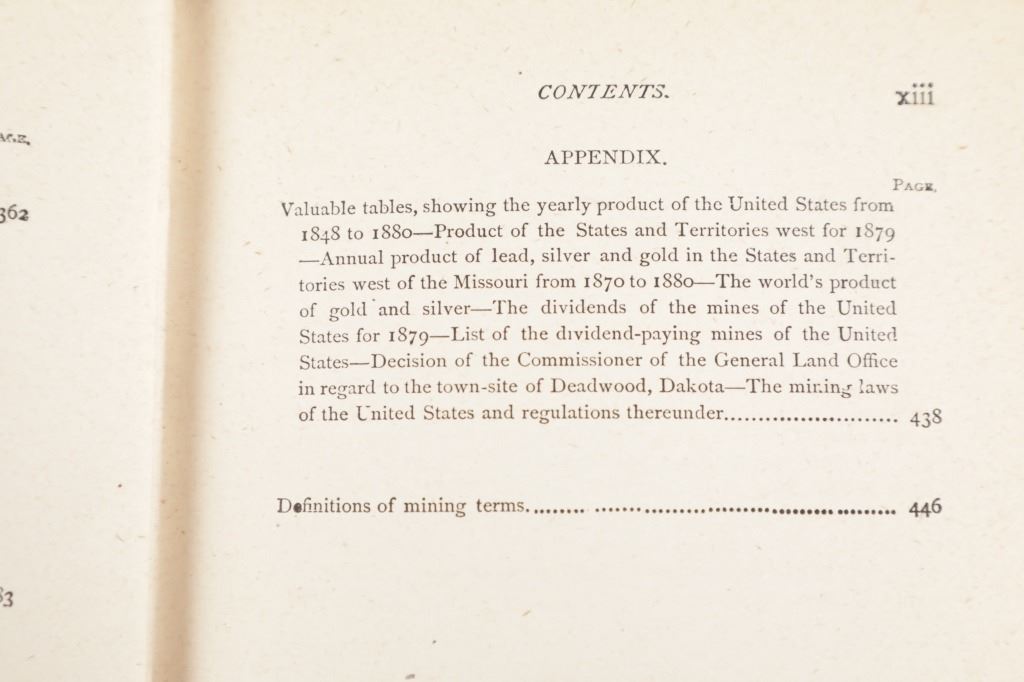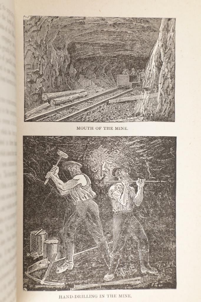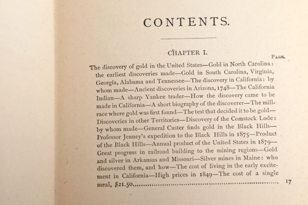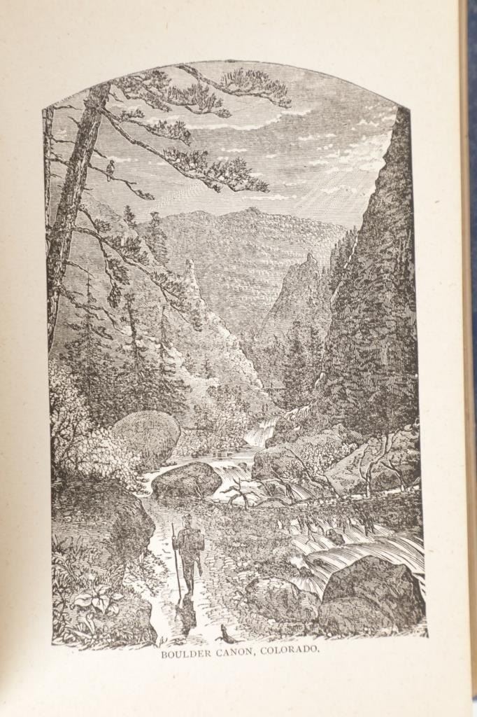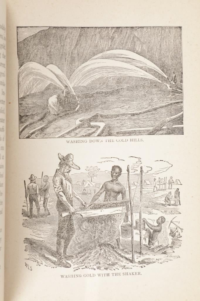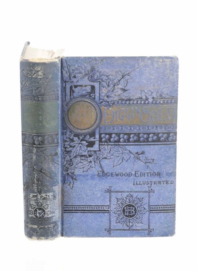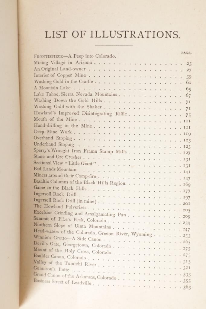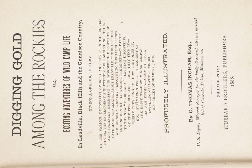 For your consideration is this 1888 of “Digging Gold Among the Rockies” by G. Thomas Ingham, Esq., Hubbard Brothers, Philadelphia publishers, Edgewood Edition Illustrated. "Digging Gold Among the Rockies or Exciting Adventures of Wild Camp Life in Leadville, Black Hills and the Gunnison Country” provides a graphic history of the various discoveries of gold and silver in the United States, the development and extent of our mining industries. As a Deputy Mineral Surveyor for the United States during the late 1800s who was involved daily with the technical aspects of mining, Ingham infuses this book with a wealth of facts and a truly colorful history that defined the mining industry of the time. "Digging Gold Among the Rockies" provides a brief history of the discovery of gold and silver in the eastern United States and California, but quickly claims the Colorado Rockies and the Black Hills of the Dakotas as its primary focus. In this fascinating book, Ingham explains the differences between placer and lode mining and the equipment used for each. He writes about the first discoveries, early mining laws, mine locations, mining terms, towns that sprang-up in the mining areas, and the contagious boomtown atmosphere that was everywhere. He explains the salting of mines, warns of robbers and thieves and the dangers of gambling and drinking, and also includes short biographies of some of the mining giants of his era. Yet, even with mining being central to this work, Ingham still takes the time to describe the pleasures he experienced while hunting in the mountains and fishing in the area's clear, rushing streams. 36 illustrations. This blue cloth bound gold gilt stamped illustrated hardcover is in fair condition, scuffing exhibited to covers and edges, gold gilt faded, loose spine. Intact pages exhibit age tanning and slight foxing throughout. Measures 5.25"W x 7.5"L x 1.5"D, weight is 1lb, 8oz.