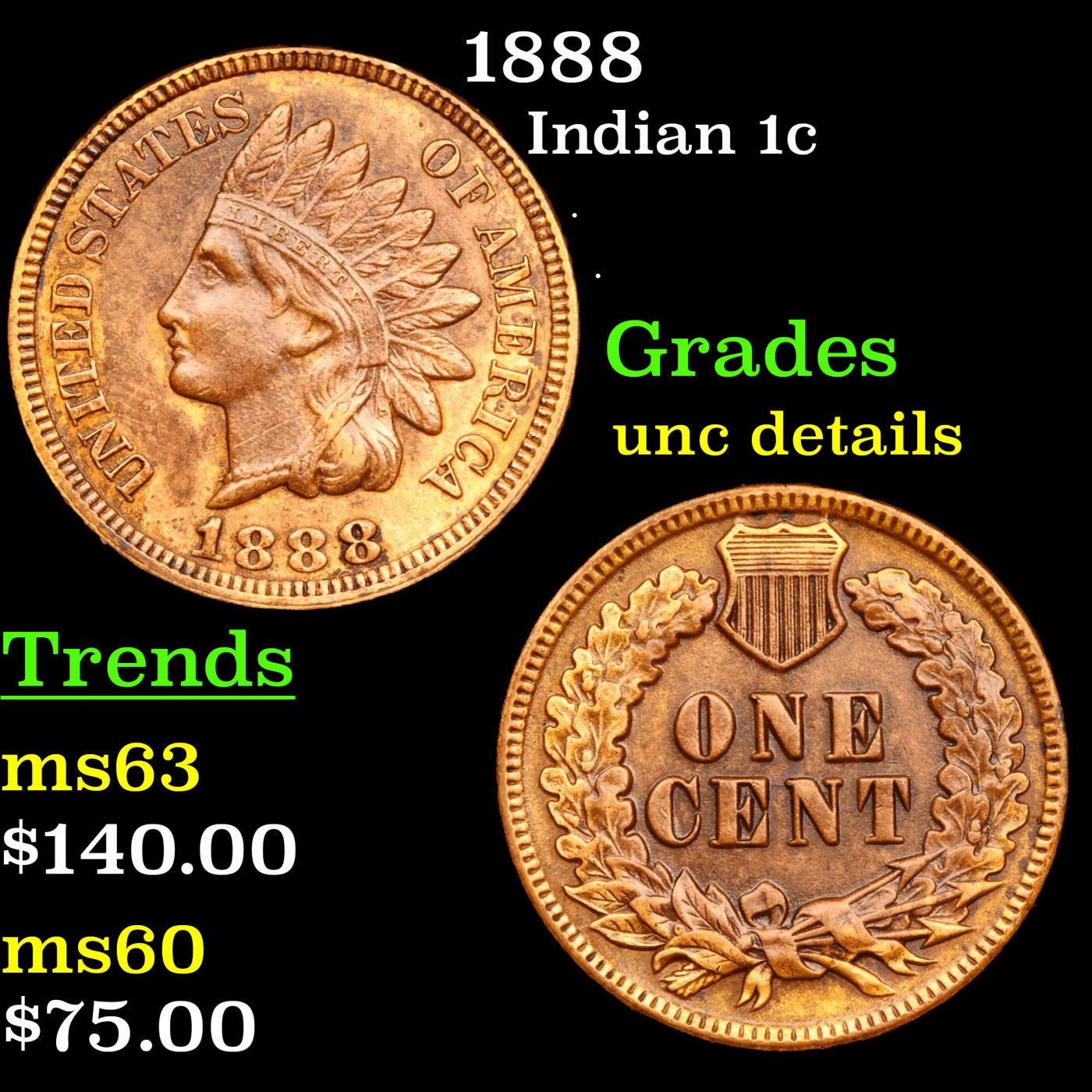 1888 Indian Cent 1c Grades Unc Details.