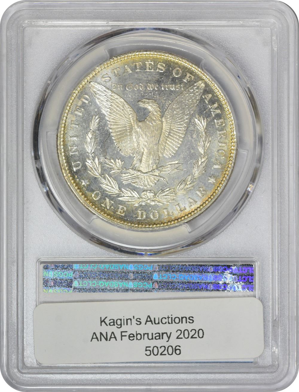 Satiny in the fields and lightly frosted on the devices. Varied champagne-gold iridescence engages both sides of this lustrous Morgan dollar.