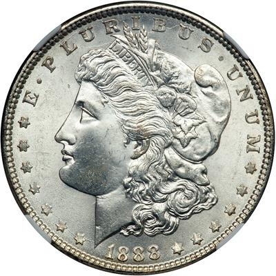 1888 Morgan Dollar. NGC graded MS-66. Predominantly untoned. A lovely sparkling Gem Morgan packed to the rafters with luster. Pop 656; 56 finer, 12 in 66 Star, 42 in 67, 1 in 67 Star, 1 in 68 (PCGS # 7182) .