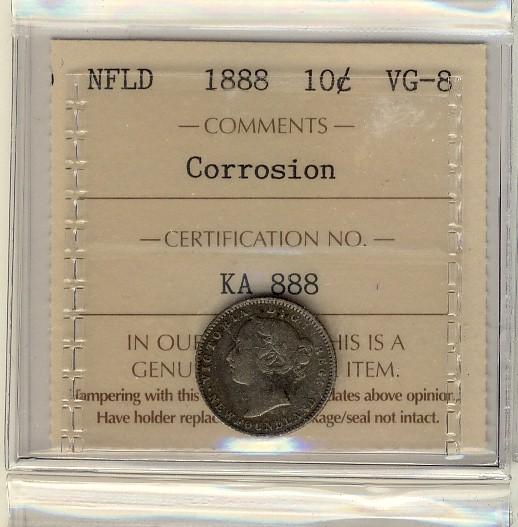 1888 NFLD 10¢ ICCS VG8 Light Corrosion