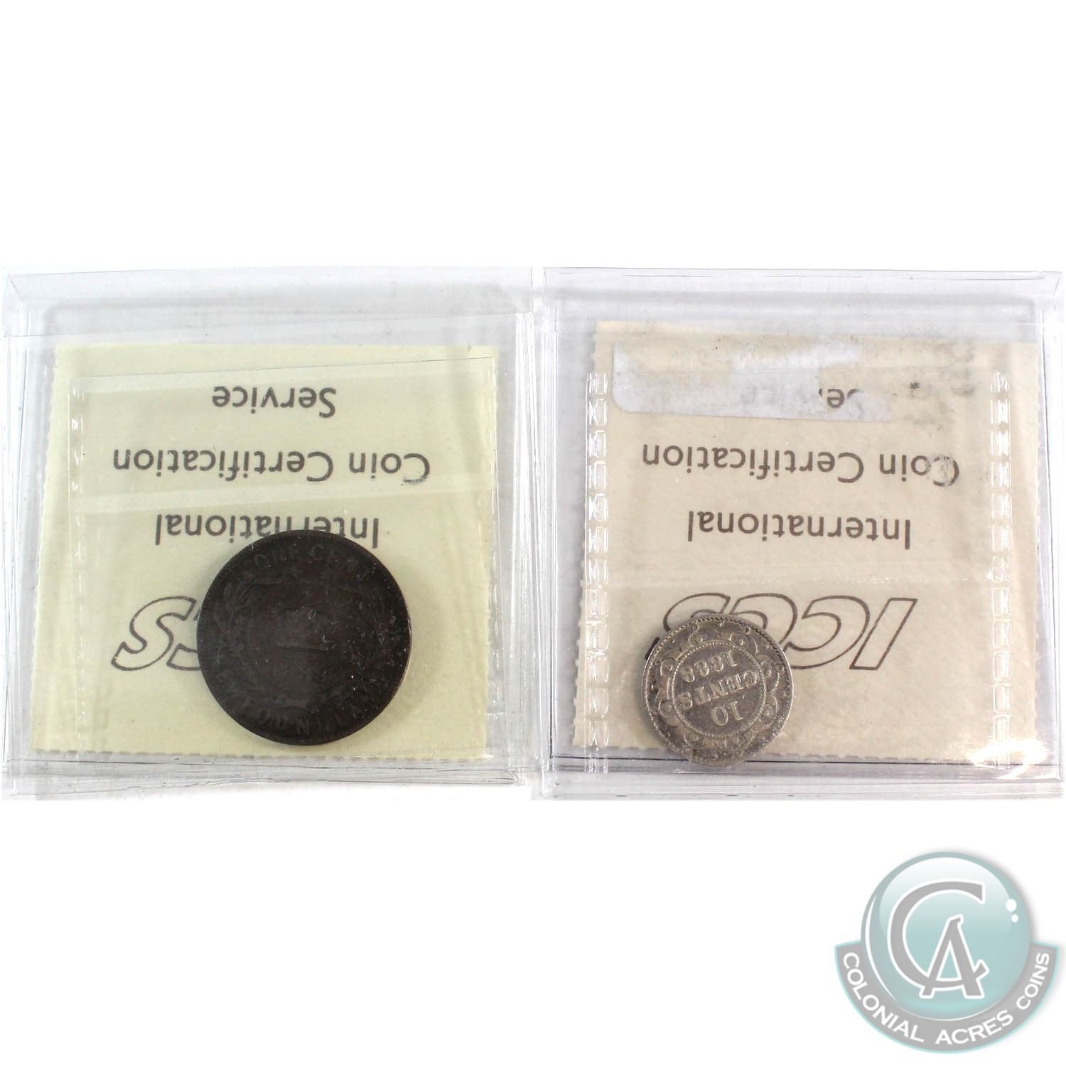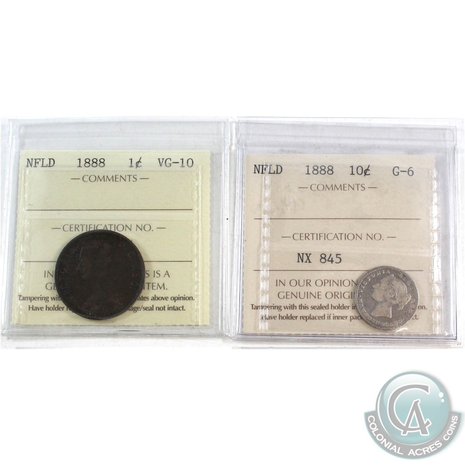 1888 NFLD 10-cent G-6 & 1888 NFLD 1-cent VG-10. Both coins have been certified by ICCS. 2pcs.