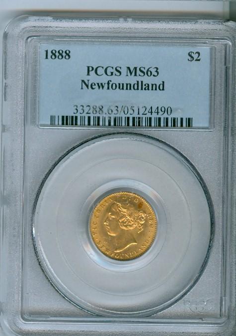 1888 Nfld $2 Gold PCGS MS63, strong lustre with good eye appeal.