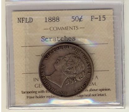1888 Nfld 50¢ ICCS F15. Designated, Scratches. Scratches appear on reverse.