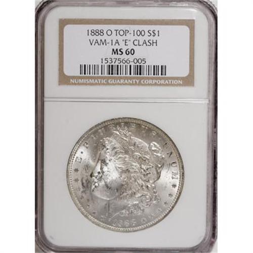 <B>1888-O $1 MS60 NGC.</B></I> VAM-1A. "E" Clash. A Top 100 variety. NGC Census: (22/14445). PCGS Population (36/12827). Mintage: 12,150,000. Numismedia Wsl. Price for NGC/PCGS coin in MS60: $27. (#7184)<BR><BR><B>Coin Engraver:</B> George T. Morgan<BR><BR><b>Shipping:</b> Coins & Currency (<a target="_blank" href="http://www.heritageauctions.com/common/shipping.php">view shipping information</a>)