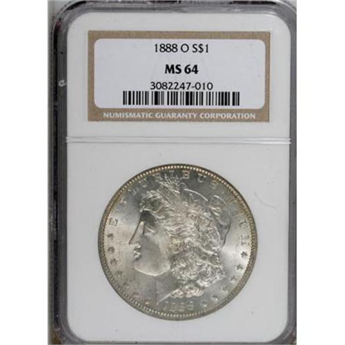 <B>1888-O $1 MS64 NGC.</B></I> NGC Census: (7427/1233). PCGS Population (5200/1593). Mintage: 12,150,000. Numismedia Wsl. Price for NGC/PCGS coin in MS64: $60. (#7184)<BR><BR><B>Coin Engraver:</B> George T. Morgan<BR><BR><b>Shipping:</b> Coins & Currency (<a target="_blank" href="http://www.heritageauctions.com/common/shipping.php">view shipping information</a>)