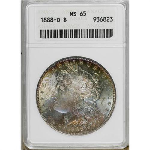 <B>1888-O $1 MS65 ANACS.</B></I> . NGC Census: (1207/42). PCGS Population (1465/165). Mintage: 12,150,000. Numismedia Wsl. Price for NGC/PCGS coin in MS65: $344. (#7184)<BR><BR><B>Coin Engraver:</B> George T. Morgan<BR><BR><b>Shipping:</b> Coins & Currency (<a target="_blank" href="http://www.heritageauctions.com/common/shipping.php">view shipping information</a>)