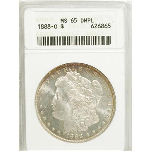 <B>1888-O $1 MS65 Deep Mirror Prooflike ANACS.</B></I> Intense white-on-black contrast is evident on each side of this enticing Gem example. The fields display illimitable depths of reflectivity, and the central devices are pleasingly frosted. A few trivial marks on Liberty's cheek, as well as in the left obverse and reverse fields, prohibit an even loftier numerical grade. <BR><BR><b>Shipping:</b> Coins & Currency (<a target="_blank" href="http://www.heritageauctions.com/common/shipping.php">view shipping information</a>)