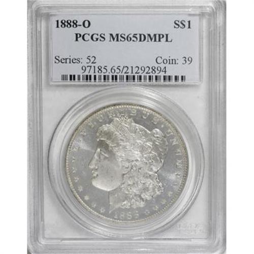 <B>1888-O $1 MS65 Deep Mirror Prooflike PCGS.</B></I> VAM-9. A Top 100 Variety. Doubled Die Reverse. Prominent doubling is noted on the reverse arrows, arrowheads, and wreath. This Gem is well struck and essentially untoned, with watery reflectivity in the fields. A small brown spot is noted just above the eagle's beak. <BR><I>From the Diamond Head Registry Set of Prooflike Dollars.</B></I><BR><BR><b>Shipping:</b> Coins & Currency (<a target="_blank" href="http://www.heritageauctions.com/common/shipping.php">view shipping information</a>)