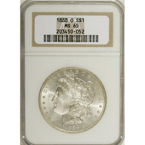 <B>1888-O $1 MS65 NGC.</B></I> NGC Census: (1186/40). PCGS Population (1404/156). Mintage: 12,150,000. Numismedia Wsl. Price for NGC/PCGS coin in MS65: $344. (#7184)<BR><BR><b>Shipping:</b> Coins & Currency (<a target="_blank" href="http://www.heritageauctions.com/common/shipping.php">view shipping information</a>)