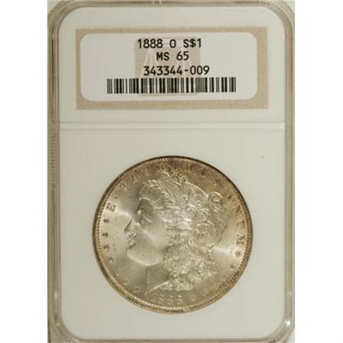 <B>1888-O $1 MS65 NGC.</B></I> NGC Census: (1189/40). PCGS Population (1389/156). Mintage: 12,150,000. Numismedia Wsl. Price for NGC/PCGS coin in MS65: $344. (#7184)<BR><BR><b>Shipping:</b> Coins & Currency (<a target="_blank" href="http://www.heritageauctions.com/common/shipping.php">view shipping information</a>)