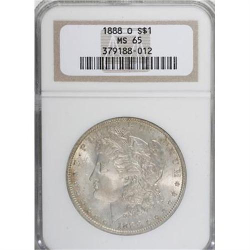 <B>1888-O $1 MS65 NGC.</B></I> . NGC Census: (1207/42). PCGS Population (1465/165). Mintage: 12,150,000. Numismedia Wsl. Price for NGC/PCGS coin in MS65: $344. (#7184)<BR><BR><B>Coin Engraver:</B> George T. Morgan<BR><BR><b>Shipping:</b> Coins & Currency (<a target="_blank" href="http://www.heritageauctions.com/common/shipping.php">view shipping information</a>)