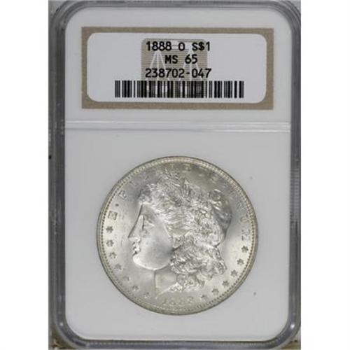 <B>1888-O $1 MS65 NGC.</B></I> . NGC Census: (1207/42). PCGS Population (1467/165). Mintage: 12,150,000. Numismedia Wsl. Price for NGC/PCGS coin in MS65: $344. (#7184)<BR><BR><B>Coin Engraver:</B> George T. Morgan<BR><BR><b>Shipping:</b> Coins & Currency (<a target="_blank" href="http://www.heritageauctions.com/common/shipping.php">view shipping information</a>)