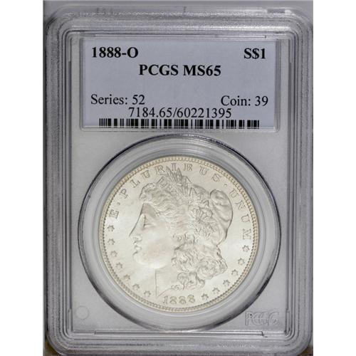 <B>1888-O<$1> MS65 PCGS.</B></I> Satiny-white and endowed with frosty, boldly detailed central devices that have escaped any meaningful abrasions. <BR><BR><B>Important notice:</B> Heritage usually auctions material at the rate of 200-250 lots per hour. On some occasions eBay Live bid software or the Internet may not be able to keep up with the pace of the auction. We recommend placing a realistic absentee bid now as insurance to avoid disappointment. Occasionally the auctioneer may eliminate or reject an eBay Live bid, and the auctioneer may also reopen a lot after the close of the eBay live bidding (usually because we missed an audience bid), and may reject your bid even if it shows you as the winning bidder. By bidding via eBay Live, you agree that Heritage may award the lot to another bidder at its sole discretion under the circumstances described above or any other reasonable circumstances. Since eBay bids are not shown to us until we open the lot on the floor, we treat those bids just like floor bids. In most cases the floor responds before the eBay bid is presented to us, due to Internet lag time, so for consistency we have made it a policy that floor bids are always considered first over tie eBay live bids. Also please note that all Heritage lots purchased through eBay Live carry a 20% Buyer's Premium. Please make sure you read the Terms and Conditions before you bid. This lot is being auctioned in conjunction with a live floor auction by Heritage Galleries & Auctioneers. All final auction and invoice information will be supplied by Heritage Galleries & Auctioneers, and all other information should be considered preliminary. Lot:3486 <BR><BR><B>Winning Notification and Billing:</B> After the FINAL session in this auction is complete, Heritage will send e-mail and snail mail invoices. This process normally takes several days. All final auction and invoice information will be supplied by Heritage Galleries & Auctioneers, and all other information should be considered preliminary. <BR><BR>This auction will be conducted on a live auction floor and over the Internet through eBay Live. If you choose to place an absentee bid, please take a moment to <font color='#0000ff'><u><a href='http://pages.ebay.com/liveauctions/help/before/laabsentee.html'>learn how eBay Live absentee bidding works</a></u></font><font color='#000000'>