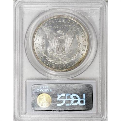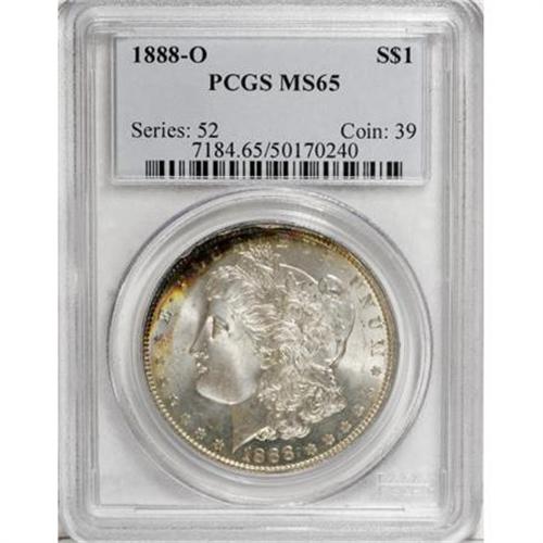 <B>1888-O $1 MS65 PCGS.</B></I> A touch of rainbow toning graces the upper left obverse border. Well struck, save for softness in the hair above Liberty's ear. Lustrous and carefully preserved, with few marks on either side. <BR><BR><B>Coin Engraver:</B> George T. Morgan<BR><BR><b>Shipping:</b> Coins & Currency (<a target="_blank" href="http://www.heritageauctions.com/common/shipping.php">view shipping information</a>)