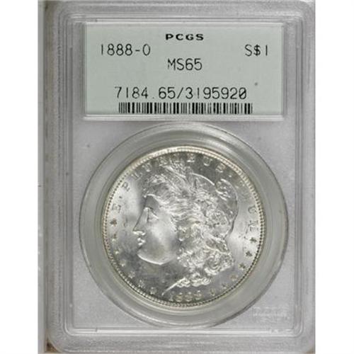 <B>1888-O $1 MS65 PCGS.</B></I> A frosty and lustrous Gem with minimal surface marks on either side. Most Mint State pieces from the Treasury hoard are in lower Mint State grades.<BR><BR><B>Coin Engraver:</B> George T. Morgan<BR><BR><b>Shipping:</b> Coins & Currency (<a target="_blank" href="http://www.heritageauctions.com/common/shipping.php">view shipping information</a>)