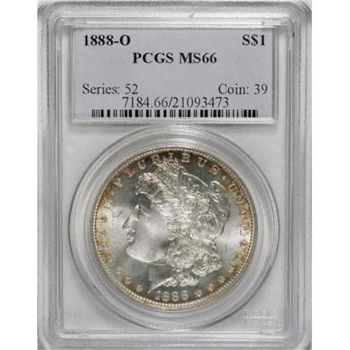 <B>1888-O $1 MS66 PCGS.</B></I> A gorgeous Premium Gem, tied for the finest that PCGS has graded, with fully brilliant silver surfaces on the obverse and reverse. Delightful gold and iridescent toning near the borders on each side adds to the eye appeal of this piece.<BR><BR><B>Coin Engraver:</B> George T. Morgan<BR><BR><b>Shipping:</b> Coins & Currency (<a target="_blank" href="http://www.heritageauctions.com/common/shipping.php">view shipping information</a>)
