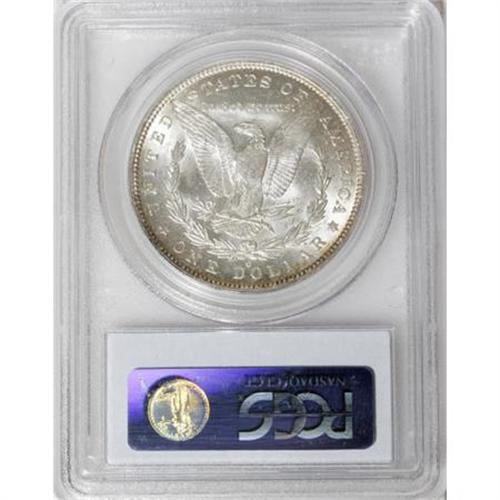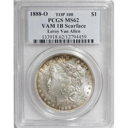 <B>1888-O $1 Scarface Die Break Obverse MS62 PCGS.</B></I> Ex: Leroy Van Allen. VAM 1B. A Top 100 Variety. A desirable Very Late Die State with the die break going into the hair. The break begins at the border at 10 o'clock, through the pellet between E and P, and continues to curve across Liberty's cheek and neck. Although the surfaces are lightly marked, the overall appearance of this piece is excellent, with faint gold toning, framed by peripheral iridescence on the obverse. Population: 11 in 62, 6 finer (3/08).<BR><I>From The Leroy Van Allen Collection.</B></I><BR><BR><b>Shipping:</b> Coins & Currency (<a target="_blank" href="http://www.heritageauctions.com/common/shipping.php">view shipping information</a>)