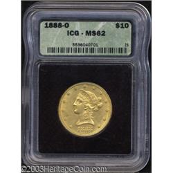 <table><tr><td><TABLE cellSpacing=0 cellPadding=0 width="100%" bgColor=#000000 border=0><TBODY> <TR><TD width="100%"><TABLE cellSpacing=1 cellPadding=3 width="100%" border=0><TBODY><TR><TD width="100%" bgColor=#79735c><FONT face=arial color=#ffffff size=3><B>Description</B> </FONT></TD></TR><TR><TD width="100%" bgColor=#ffffff><FONT face=arial size=2><B>1888-O $10 MS62 ICG.</B></I> A meticulously struck New Orleans Eagle that is free from offensive abrasions. Struck from clashed and lightly cracked dies. Only 21,335 pieces were struck.<BR><I>From The Jerry Doty Collection.</B></I> </FONT></TD></TR></TBODY></TABLE></TD></TR></TBODY></TABLE><BR><A name=PricesRealized></A><TABLE cellSpacing=0 cellPadding=0 width="100%" bgColor=#000000 border=0><TBODY><TR><TD width="100%"><TABLE cellSpacing=1 cellPadding=3 width="100%" border=0><TBODY><TR><TD width="100%" bgColor=#79735c><A name=PR><FONT face=arial color=#ffffff size=3><B>Previous Prices from Heritage Auctions</B> </FONT></A></TD></TR><TR><TD bgColor=#f6f6ed><TABLE cellSpacing=0 cellPadding=0 width="100%" border=1><TBODY><TR><TD align=middle width="33%"><B>Date</B></TD><TD align=middle width="33%"><B>Service</B></TD><TD align=middle width="33%"><B>Price</B></TD></TR><TR bgColor=whitesmoke><TD width="33%"><B>08/27/2002</B></TD><TD width="33%">NGC</TD><TD width="33%">$1,092.50</TD></TR><TR bgColor=whitesmoke><TD width="33%"><B>10/04/2000</B></TD><TD width="33%">PCGS</TD><TD width="33%">$1,006.25</TD></TR><TR bgColor=whitesmoke><TD width="33%"><B>09/23/1998</B></TD><TD width="33%">NGC</TD><TD width="33%">$1,270.50</TD></TR><TR bgColor=whitesmoke><TD width="33%"><B>10/02/2000</B></TD><TD width="33%">PCGS</TD><TD width="33%">$1,035.00</TD></TR><TR bgColor=whitesmoke><TD width="33%"><B>06/01/1997</B></TD><TD width="33%">NGC</TD><TD width="33%">$1,375.00</TD></TR></TBODY></TABLE></TD></TR><TR><TD bgColor=#ffffff><FONT face=arial size=1 ?>PLEASE NOTE: All prices realized reflect the final hammer price PLUS the buyer's premium in auctions that charge a buyer's premium. Each item has a notation at the top of the listing indicating whether that lot included a buyer's premium. Example: A item that sells with a final hammer price of $100 and a 20% buyer's premium will display with a price realized of $120. All information listed is intended to be as accurate as possible, but errors are possible. Please use this guide carefully and inform us of any inaccuracies. </FONT></TD></TR></TBODY></TABLE></TD></TR></TBODY></TABLE><BR><TABLE cellSpacing=0 cellPadding=0 width="100%" bgColor=#000000 border=0><TBODY><TR><TD width="100%"><TABLE cellSpacing=1 cellPadding=3 width="100%" border=0><TBODY><TR><TD width="100%" bgColor=#79735c colSpan=6><FONT face=arial color=#ffffff size=3><B>Price Guide*</B> </FONT></TD></TR><TR bgColor=#f6f6ed><TD align=middle><B>Grade</B> </TD><TD align=middle><B>Coin World<BR>(Trends)</B> </TD><TD align=middle><B>Numismedia<BR>Retail</B> </TD><TD align=middle><B>Numismedia<BR>Wholesale</B> </TD><TD align=middle><B>Coin<BR>Universe</B> </TD><TD align=middle><B>Heritage<BR>Value Index</B> </TD></TR><TR bgColor=#ffffff><TD align=middle>61</TD><TD align=right>---</TD><TD align=right>$690.00</TD><TD align=right>$550.00</TD><TD align=right>$750.00</TD><TD align=right>$805.25</TD></TR><TR style="FONT-WEIGHT: bold" bgColor=#cccfdd><TD align=middle>62</TD><TD align=right>$1,850.00</TD><TD align=right>---</TD><TD align=right>$1,325.00</TD><TD align=right>$1,450.00</TD><TD align=right>$1,383.25</TD></TR><TR bgColor=#ffffff><TD align=middle>63</TD><TD align=right>$6,000.00</TD><TD align=right>---</TD><TD align=right>$4,000.00</TD><TD align=right>---</TD><TD align=right>$4,041.67</TD></TR><TR bgColor=#ffffff><TD colSpan=6><FONT size=1>*All information listed is intended to be as accurate as possible, but errors are possible. No item may be returned or refused based on this information which is provided as a service to our customers. You should contact each pricing source directly to determine the accuracy of this information. </FONT></TD></TR></TBODY></TABLE></TD></TR></TBODY></TABLE><BR><TABLE cellSpacing=0 cellPadding=0 width="100%" bgColor=#000000 border=0><TBODY><TR><TD width="100%"><TABLE cellSpacing=1 cellPadding=3 width="100%" border=0><TBODY><TR><TD width="100%" bgColor=#79735c><FONT face=arial color=#ffffff size=3><B>Population Guide</B> </FONT></TD></TR><TR bgColor=#ffffff><TD align=middle><!-- Begin Output of Population Grid--><TABLE cellSpacing=0 cellPadding=0 width="100%" border=0><TBODY><TR><TD vAlign=center><TABLE cellSpacing=0 width="100%" border=1 cellsadding="3"><TBODY><TR><TD vAlign=center><TABLE cellSpacing=0 cellPadding=3 width="100%" border=1><TBODY><TR><TD vAlign=center align=middle bgColor=#f0f1e8 colSpan=2 <CENTER><FONT face=Arial size=2><B>PCGS Pop </B></FONT><CENTER></CENTER></TD><TD vAlign=center align=middle bgColor=#f0f1e8 colSpan=2><CENTER><FONT face=Arial size=2><B>NGC Pop</B></CENTER></FONT></TD></TR><TR><TD vAlign=center><FONT face=Arial size=2>(62)</FONT> </TD><TD vAlign=center align=right><FONT face=Arial size=2>82</FONT> </TD><TD vAlign=center><FONT face=Arial size=2>(62)</FONT> </TD><TD vAlign=center align=right><FONT face=Arial size=2>69</FONT> </TD></TR><TR><TD vAlign=center><FONT face=Arial size=2>(>62)</FONT> </TD><TD vAlign=center align=right><FONT face=Arial size=2>16</FONT> </TD><TD vAlign=center><FONT face=Arial size=2>(>62)</FONT> </TD><TD vAlign=center align=right><FONT face=Arial size=2>2</FONT> </TD></TR></TBODY></TABLE></TD></TR></TBODY></TABLE></TD></TR></TBODY></TABLE><!-- End Output of Population Grid--></TD></TR></TBODY></TABLE></TD></TR></TBODY></TABLE><BR><TABLE cellSpacing=0 cellPadding=0 width="100%" bgColor=#000000 border=0><TBODY><TR> Important notice: Heritage usually auctions material at the rate of 200-250 lots per hour. On some occasions eBay Live bid software or the Internet may not be able to keep up with the pace of the auction. We recommend placing a realistic absentee bid now as ins