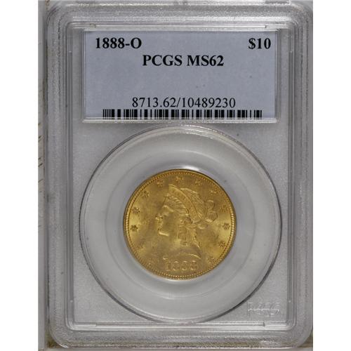 <B>1888-O $10 MS62 PCGS.</B></I> A nicely struck yellow-green piece with good luster and no obvious marks. A small gray spot at 9 o'clock on the reverse bears a faint abrasion. Minor die doubling is evident on the reverse's peripheral lettering.<BR><BR><b>Shipping:</b> Coin/Currency (<a target="_blank" href="http://www.heritageauctions.com/common/shipping.php">view shipping information</a>)