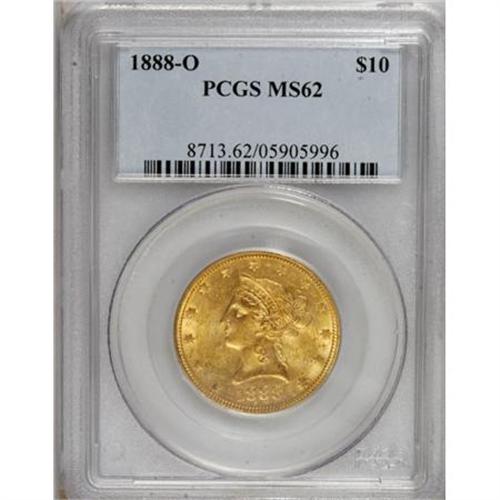 <B>1888-O $10 MS62 PCGS.</B></I> This scarce New Orleans ten displays unbroken cartwheel shimmer, and the strike is bold aside from the star centers. Wispy marks are scattered but never distract.<BR><BR><B>Coin Engraver:</B> Christian Gobrecht<BR><BR><b>Shipping:</b> Coins & Currency (<a target="_blank" href="http://www.heritageauctions.com/common/shipping.php">view shipping information</a>)