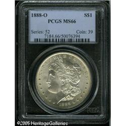 <B>1888-O<img border='0' src='http://www.heritagecoins.com/images/star.gif' width=10 height=10>$1 MS66 PCGS.</B></I> Striking quality varies greatly on 1888-O dollars, and if one has been holding out for an absolute full strike, then this is the coin. Additionally, the surfaces are extraordinarily clean with smooth, satiny mint luster and the coin is untoned on each side. Population: 101 in 66, 0 finer (1/05). Lot:10266