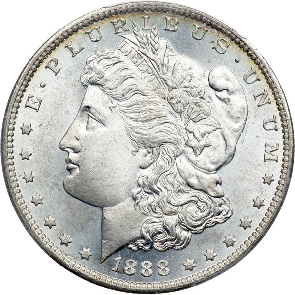 1888-O Morgan Dollar. PCGS graded MS-66+. Well struck and mostly untoned. Semi-reflective fields. By far, and extremely rare coin in this condition. The usual 1888-O tends to come bagmarked. This coin by comparision, is in the top PCGS category: Pop 5; none finer at PCGS in Mint State (PCGS # 7184) .