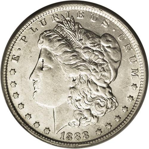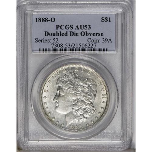 <B>1888-O<img border='0' src='http://www.heritagecoins.com/images/star.gif' width=10 height=10>$1> Doubled Die Obverse AU53 PCGS.</B></I> VAM-4. Top 100 Variety. The so-called "Hot Lips" variety, that has clear die doubling on Liberty's mouth and nose. Overzealous die lapping caused the bases of ERT in LIBERTY to disappear. Just a hint of golden color shows on the reverse of this otherwise silver-gray example. A few minor abrasions serve to limit the grade.<BR><I>From The Chicago-Ark Collection.</B></I>